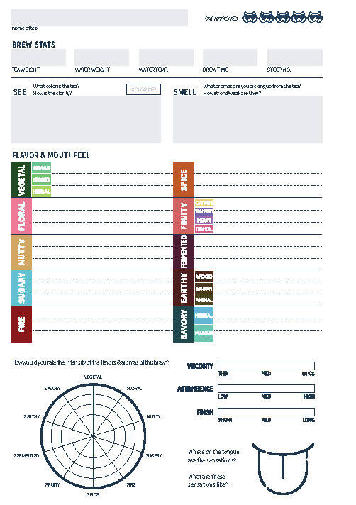 The tasting sheets in this journal is designed to help you draw abstract associations from tasting notes (e.g. the flavors of cut grass = wise and composed), so that you can see if the personality of the tea matches that of your chosen cat(s).